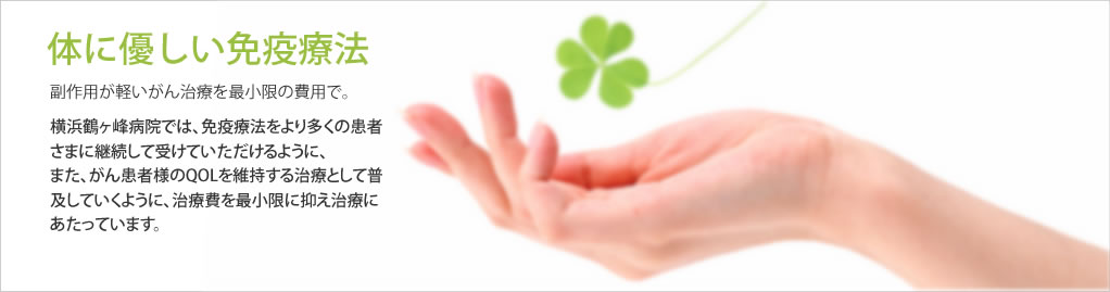 横浜鶴ヶ峰病院付属予防医療クリニックでは、「がん」と闘っている患者様とご家族をひとりでも多くサポートしたいという思いから「体に優しい免疫療法」を実施しています。免疫療法は、すべてのがん患者様を治療できるような夢の治療法ではありません。しかし、わたしの腫瘍外科医としての経験と900例を超える免疫療法担当医としての経験から、この免疫療法は患者様の身体的負担はほとんどなく、単独あるいは他の治療との組み合わせにより治療効果が期待されます。免疫療法により、患者様の免疫力は回復・増強され、病気と闘う気力と体力がよみがえり、がんに対する有効な治療効果につながると考えられます。